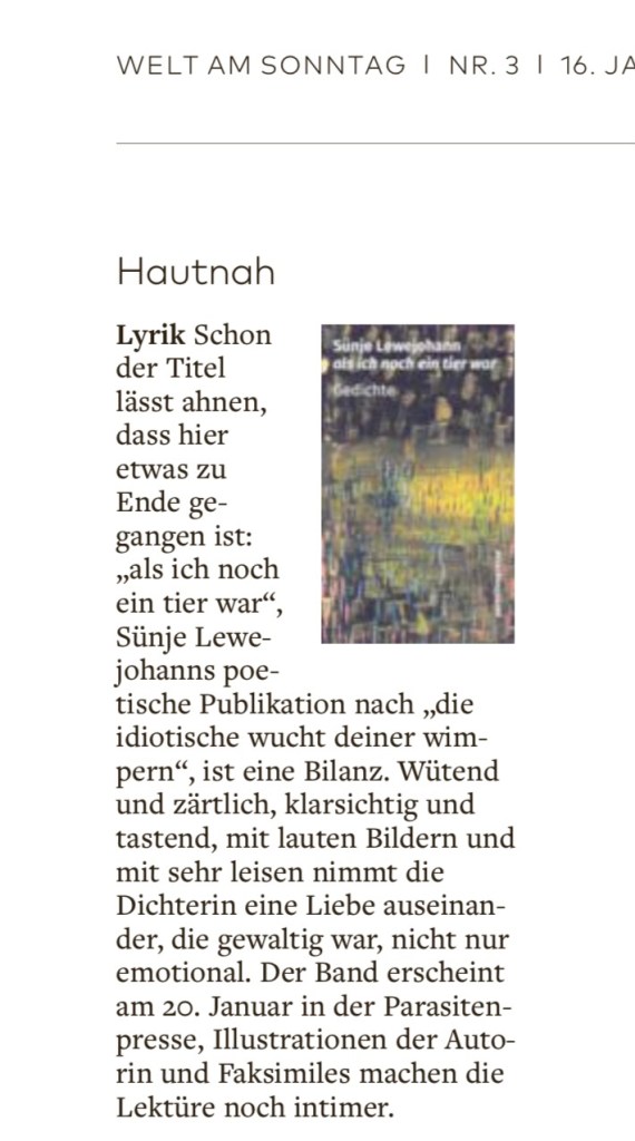 Heute ist in der Welt am Sonntag eine erste kleine Besprechung meines neuen Buches erschienen. Ich freue mich sehr. (Und nur noch ein paar Tage Geduld: das Buch ist bereits auf dem Weg von der Druckerei in den Verlag.)